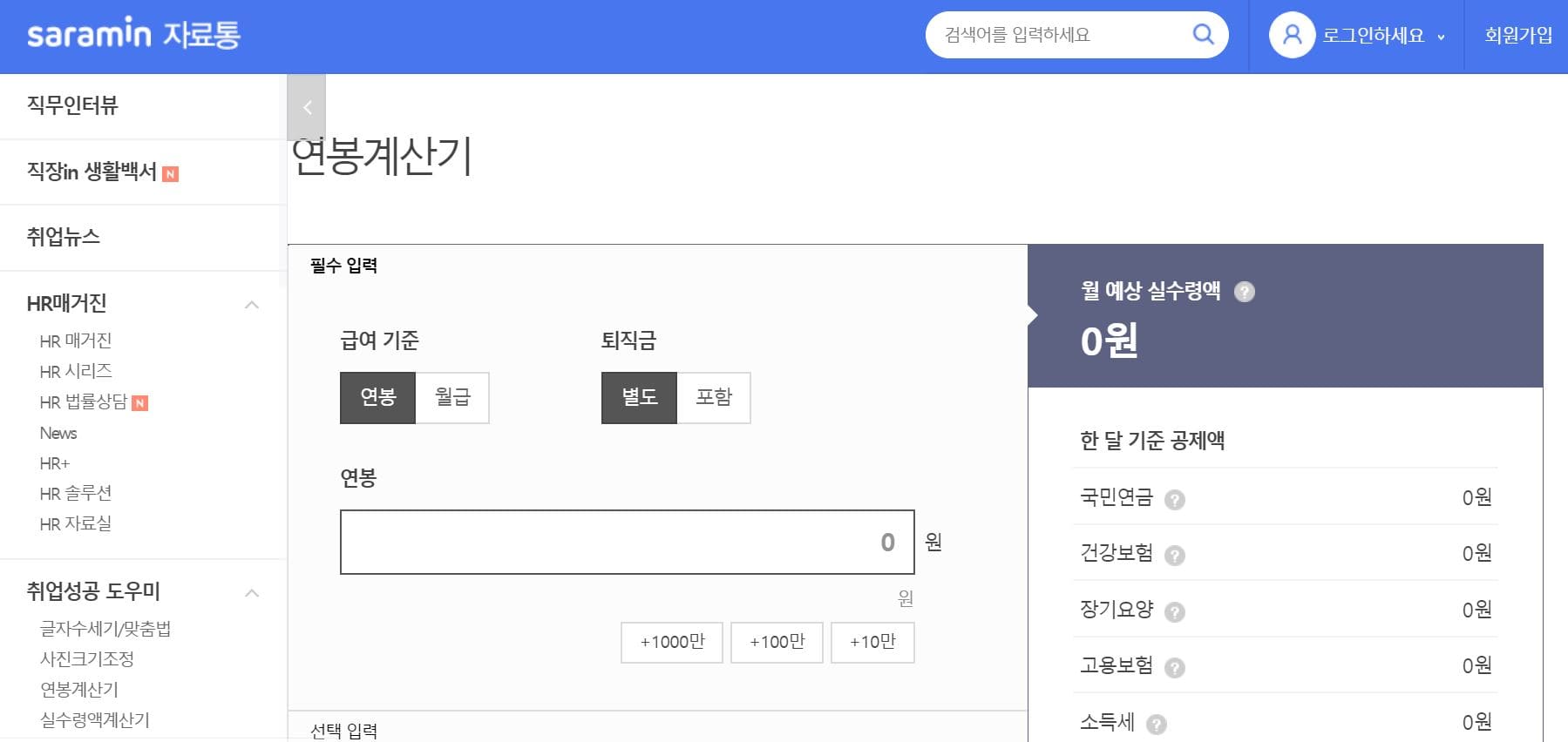 첫 월급을 받자마자 생각했던 금액과 차이가 나기 때문에 실수령 금액을 잘 따져봐야 합니다. 세후 금액을 잘못 계산해서 일 년 내내 차이나는 월급을 받을 수 있기 때문입니다. 저처럼 월급의 세후 금액이 궁금하지만 계산 방법을 몰라서 고민이신 분들을 위해 준비해 보았습니다. 사람인 연봉계산기 앱은 연봉 혹인 월급 기준으로 매월 수령액을 계산하고 싶을 때 유용한 어플입니다. 간편 입력만으로 각종 세금 및 실 수령액을 확인할 수 있습니다. 앱 실행 후 연봉, 퇴직금, 부양가족수, 자녀수 등등 나의 현재 조건을 입력해 주세요.입력 완료 후 하단 "급여계산"을 클릭해 주세요.4대 보험 및 소득세가 제외된 실수령액을 알 수 있습니다.앱을 설치하기 귀찮으신 분들은 사람인 홈페이지-자료통을 통해 웹에서도 연봉 계산이 가능하시니 참고하세요. 참고로 자료통에서는 구직에 필요한 많은 정보를 얻을 수 있으므로 자주자주 들여다 보시면 나중에 다가올 이직에도 대비하기 좋으시리라 예상됩니다.