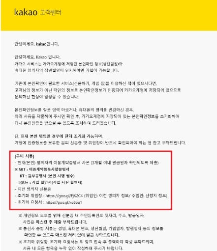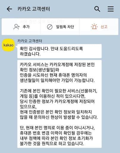 쉽게 말하면 명의가 바꼈을 경우 카카오톡 본인인증 변경이 안될 수 있다는 것입니다. 이럴 때는 쉽게 해결할 수 있는 방법이 있습니다. 카카오 고객센터로 문의하는 방법입니다.같은 계정으로 카카오톡 본인인증 변경 하고 싶으시다면 1644-7405(카카오톡 고객센터)로 전화를 하여 상담을 받아보시기 바랍니다. 월~금 10:00~18:00 상담이 가능합니다. 상담 시 본인인증에 필요한 서류들을 안내받게 되는데, 이 서류들을 제출하면 금방 해결할 수 있습니다. 그럼 원활하게 해결하셨길 바라며, 이밖에도 카카오톡에 대한 궁금증이 있으신 분들은 고객센터에서 상담받아보시기 바랍니다.