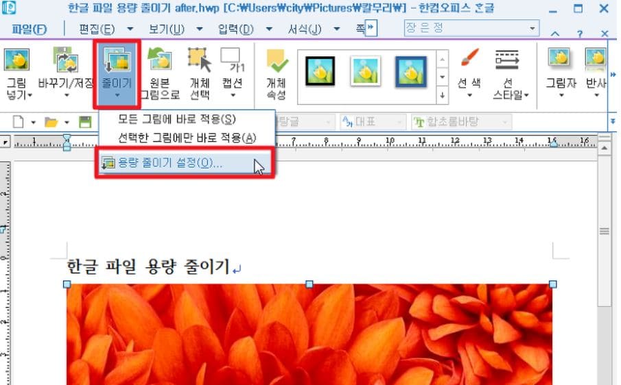 한글파일의 용량이 큰 거의 대부분의 이유는 삽입된 그림이나 이미지가 크기 때문입니다. 저는 한글2014를 사용하고 있습니다. 파일의 용량을 보니 2.73MB입니다. 이 파일안에는 여러장의 그림이 삽입되어 있기에 한글파일 용량줄이기가 꼭 필요한 상황입니다. 파일 안에 삽입된 그림 하나를 마우스로 클릭하니 그림 탭이 새로 생성됩니다. 여기서 줄이기 아이콘을 클릭하고 용량줄이기 설정을 선택합니다. 한글파일 용량줄이기는 거의 이렇게 진행됩니다. 그림줄이기 대화상자가 뜨면 저장할 때 모든 그림에 적용에 체크하고 삽입한 그림크기에 맞춰줄이기를 체크합니다. 그러고 다시 저장해보시면 한글파일 용량줄이기가 성공한 것을 찾아 보실 수 있습니다. 저렇게 사진용량을 죽이는 방법으로 진행하고 있습니다. 사진을 보시면서 참고하시면 될듯 합니다. 순서대로 보시면 됩니다.