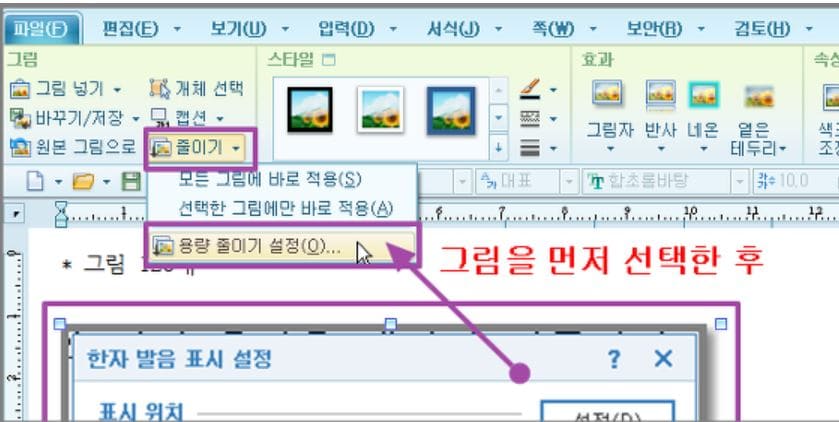 작업한 한글 문서를 게시판에 올린다던지 메일로 보낼 때 파일 용량이 많아서 줄여야 할 때가 있습니다. 이럴 때는 고해상도의 그림이 많은 용량을 차지할때가 많습니다. 아래그림으로 다시한번 참조하시기 바라며 테스트하는 한글 파일은 캡쳐한 그림파일이 들어있는 11M 용량의 파일입니다. 한글 사진 용량 줄이기를 알려드리기 위해 일단 그림이나 사진 중 하나를 클릭해서 선택하면 메뉴중에서 그림 메뉴가 활성화됩니다. 한글 사진 용량 줄이기 설정을 클릭해서 어떤 방법으로 용량을 줄일지를 결정해야합니다. 한글 사진 용량 줄이기 설정에는 여러 가지가 있는데요. 잘라낸 그림영역지우기, 삽입한 그림 크기에 맞춰 줄이기, 설정한 해상도로 변경하기가 있습니다. 설정에 따라 용량이 다르기 때문에 잘 고민하시고 선택하시면 좋을 것 같습니다. 삽입한 그림크기에 맞춰서 줄이기를 선택했습니다. 이제 그림 용량을 일괄적을 줄이면 됩니다. 다시 그림을 클릭하고 그림 메뉴 - 줄이기 – 모든 그림에 바로 적용을 선택했습니다. 이렇게 해보시면 한글 사진 용량 줄이기가 성공한걸 보실 수 있습니다. 솔직히 한글 속에서 그림파일 용량을 줄이는 방법도 있지만 그림 용량을 줄여주는 사이트들 이 있습니다. 해당 사이트들에 대해서 참고하시기 바랍니다. 사이트 종류들은 다음 포스팅에서 소개하겠습니다. [참고링크]