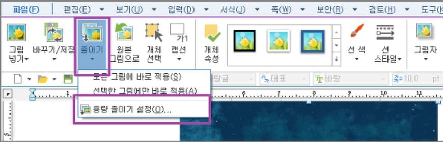 작업한 한글 문서를 게시판에 올린다던지 메일로 보낼 때 파일 용량이 많아서 줄여야 할 때가 있습니다. 이럴 때는 고해상도의 그림이 많은 용량을 차지할때가 많습니다. 아래그림으로 다시한번 참조하시기 바라며 테스트하는 한글 파일은 캡쳐한 그림파일이 들어있는 11M 용량의 파일입니다. 한글 사진 용량 줄이기를 알려드리기 위해 일단 그림이나 사진 중 하나를 클릭해서 선택하면 메뉴중에서 그림 메뉴가 활성화됩니다. 한글 사진 용량 줄이기 설정을 클릭해서 어떤 방법으로 용량을 줄일지를 결정해야합니다. 한글 사진 용량 줄이기 설정에는 여러 가지가 있는데요. 잘라낸 그림영역지우기, 삽입한 그림 크기에 맞춰 줄이기, 설정한 해상도로 변경하기가 있습니다. 설정에 따라 용량이 다르기 때문에 잘 고민하시고 선택하시면 좋을 것 같습니다. 삽입한 그림크기에 맞춰서 줄이기를 선택했습니다. 이제 그림 용량을 일괄적을 줄이면 됩니다. 다시 그림을 클릭하고 그림 메뉴 - 줄이기 – 모든 그림에 바로 적용을 선택했습니다. 이렇게 해보시면 한글 사진 용량 줄이기가 성공한걸 보실 수 있습니다. 솔직히 한글 속에서 그림파일 용량을 줄이는 방법도 있지만 그림 용량을 줄여주는 사이트들 이 있습니다. 해당 사이트들에 대해서 참고하시기 바랍니다. 사이트 종류들은 다음 포스팅에서 소개하겠습니다. [참고링크]